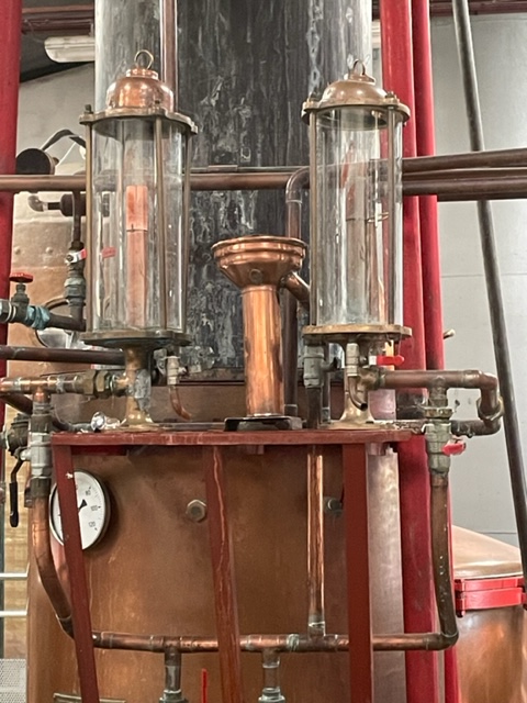 On nous ouvre ensuite les portes de la distillerie pour y découvrir le travail artisanal en arrière-boutique. Les lieux ne sont pas très impressionnants, bien au contraire, mais nous confortent dans l´idée qu´ici, c´est le savoir-faire qui se perpétue. On découvre les cuves de fermentation qui attendent les fruits délicatement sélectionnés. On fait ensuite connaissance avec Marius, César et Olive, les trois alambics de la maison qui vont permettre de distiller le moût et le jus. On les bichonne et on comprend pourquoi; car elles dégagent la passion de la distillerie. Place au travail ; Le jus et le moût sont chauffés jusqu’à plus de 78 degrés pour obtenir le brouillis re-distillé. De ce brouillis, on obtient l´alcool de tête (80 degrés) non utilisé, le cœur de chauffe (de 55 à 80 degrés) et l’alcool de queue (moins de 55 degrés). La dernière étape sera le vieillissement plus ou moins long selon les fruits. Certains passeront en fût de chênes que l´on nous présente en fin de visite.